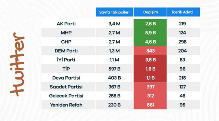 Ana muhalefet partisi CHP, rapora göre siyasi partilerin X'teki performansını gösteren tabloda da en aktif parti olmayı elden bırakmıyor. Buna göre temmuz ayında 219 paylaşımda bulunan AKP, 298 paylaşımda bulunan CHP'nin gerisinde kaldı. Buna karşılık AKP'nin 3.4 milyon, CHP'nin ise 2.7 milyon takipçisi bulunuyor.