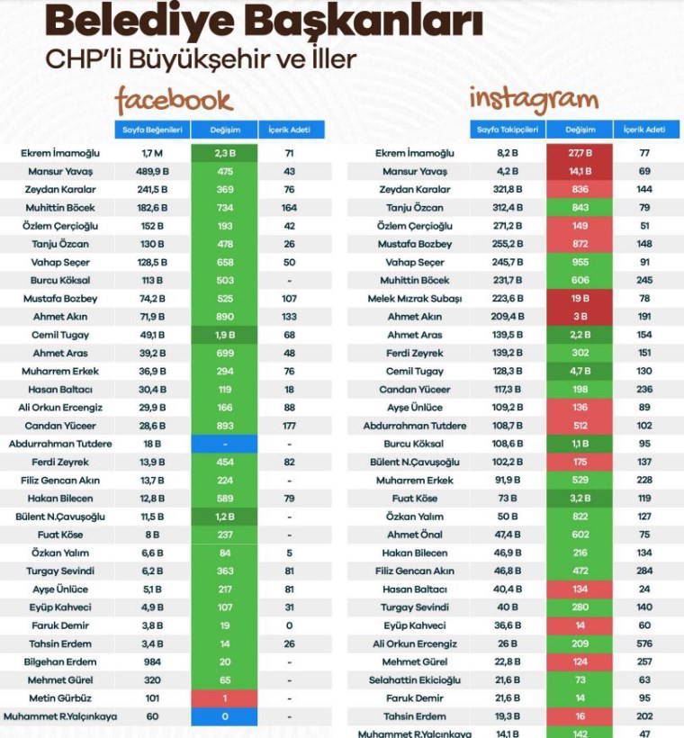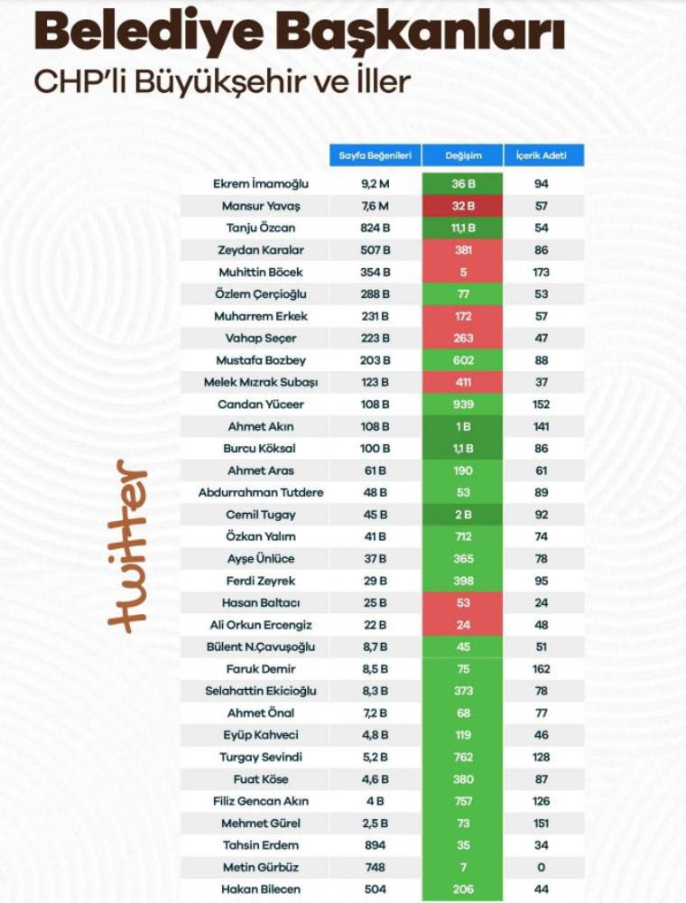CHP'li belediye başkanlarının paylaşımlarına yapılan beğeni sayısını gösteren sosyal medya performansında İBB Başkanı Ekrem İmamoğlu, Facebook, Instagram ve Twitter'da öne çıkan isim olarak görülüyor. Üç platformda da Ankara Büyükşehir Belediye Başkanı Mansur Yavaş, İmamoğlu'nun ardından ikinci sırada gelen CHP'li belediye başkanı olarak tabloda yer alıyor.