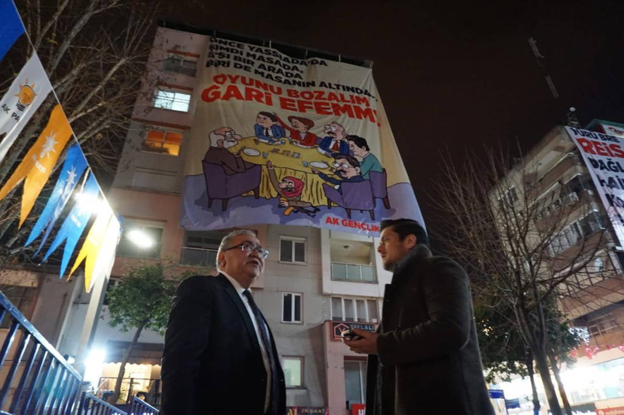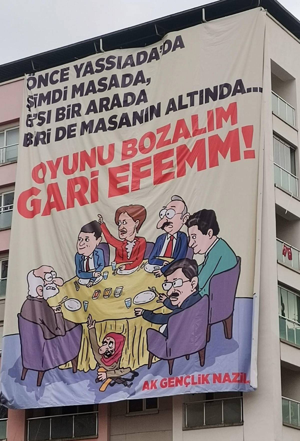 AKP Gençlik Kolları, Aydın’ın Nazilli ilçesinde bir binaya skandal bir afiş astı. Afişte Millet İttifakı'nın yuvarlak bir masa etrafında toplanmasının karikatürize edilmiş görüntüsünde silah ayrıntısı ile terör ilişkilendirmesi yapıldı.
