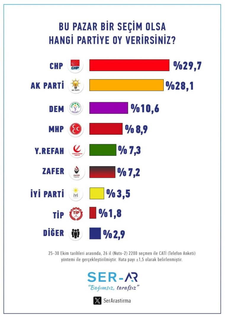Ankete sonuçlarına göre; CHP yüzde 29,7 AKP yüzde 28,1 oy alıyor.
