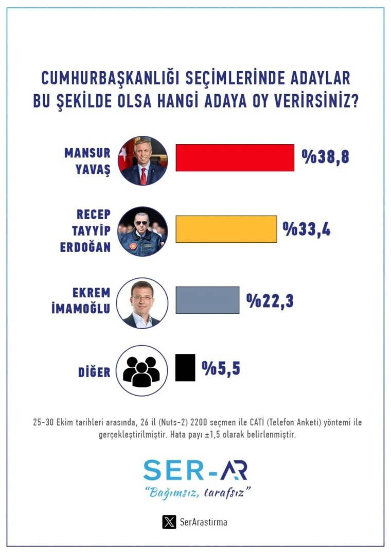Cumhurbaşkanlığında ise Erdoğan'ın yüzde 5,4 oranında önünde olan Mansur Yavaş yüzde 38,8 oy oranı ile dikkat çekti.