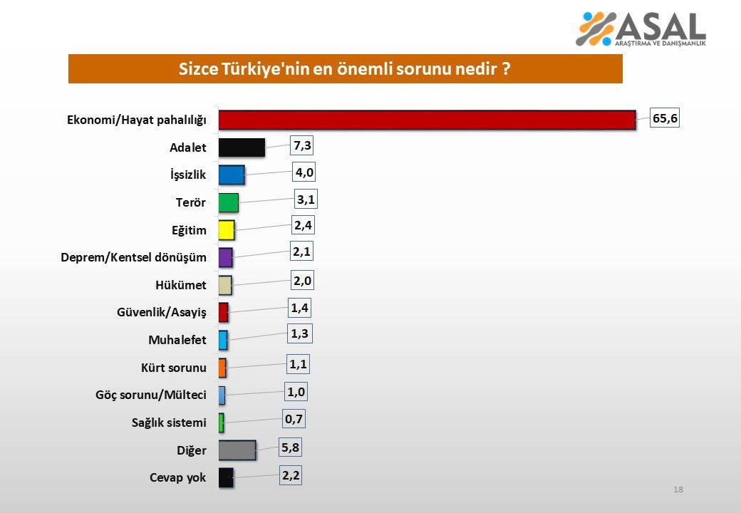 Ankete katılanların yüzde 65'i, "Sizce Türkiye'nin en önemli sorunu nedir?" sorusuna "Ekonomi / Hayat pahalılığı" yanıtını verdi.