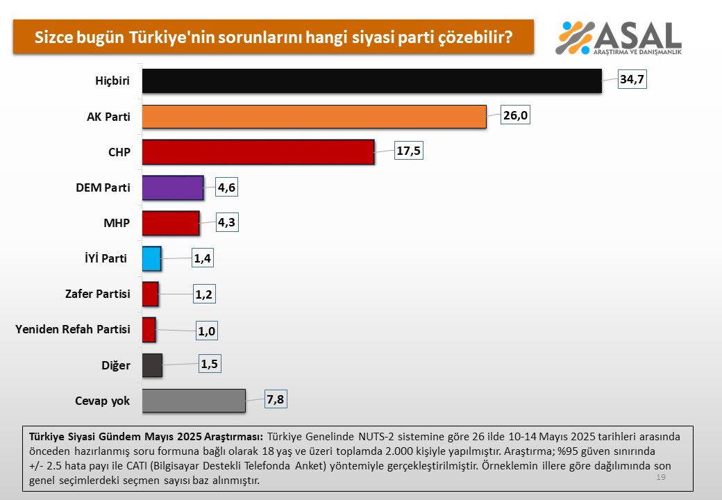 ASAL Araştırma şirketi, 26 ilde 10-14 Mayıs 2025 tarihleri arasında, 18 yaş ve üzeri 2000 kişiyle yaptığı anketin sonuçlarını kamuoyuyla paylaştı.