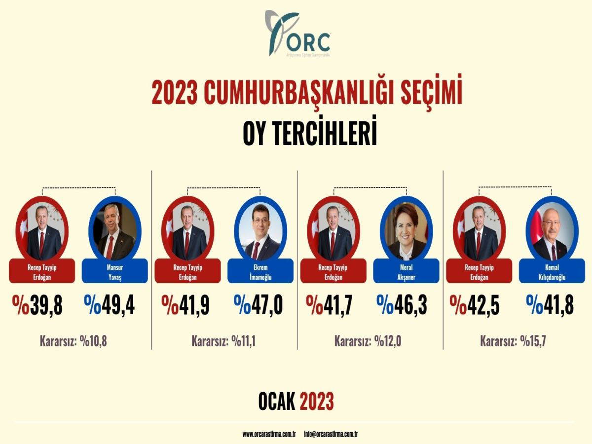 Millet İttifakı'nın cumhurbaşkanı adayı henüz netleşmemişken ORC Araştırma, "Cumhurbaşkanlığı seçimi oy tercihleri " başlıklı bir anket yayımladı.