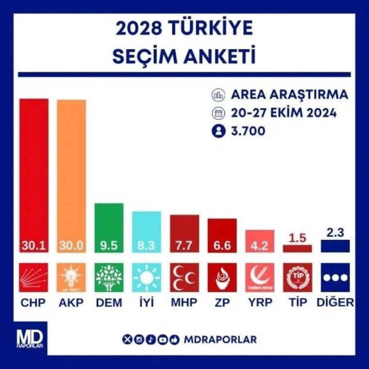 AREA Araştırma, 20-27 Ekim arasında gerçekleştirdiği ‘2028 Türkiye Seçim Anketi’ sonuçlarını paylaştı. 3 bin 700 kişinin katıldığı ankette sonuçlar dikkat çekti.