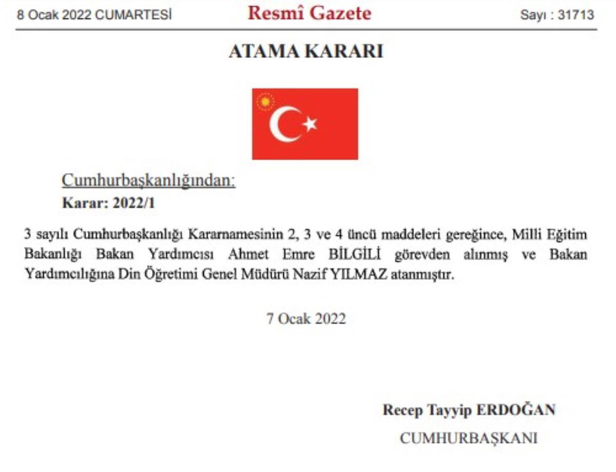 Resmi Gazete'de yayımlanan kararla, Milli Eğitim Bakanlığı Bakan Yardımcısı Ahmet Emre Bilgili görevden alındı. Bakan Yardımcılığına Din Öğretimi Genel Müdürü Nazif Yılmaz atandı.
