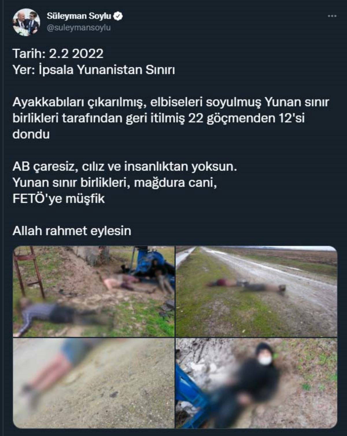 Bakan Soylu, Twitter hesabından yaptığı açıklamada, Donarak yaşamını yitiren göçmenlerin fotoğraflarını da paylaşan Soylu, "Yer: İpsala Yunanistan sınırı. Ayakkabıları çıkarılmış, elbiseleri soyulmuş, Yunan sınır birlikleri tarafından geri itilmiş 22 göçmenden 12'si dondu. AB çaresiz, cılız ve insanlıktan yoksun. Yunan sınır birlikleri, mağdura cani, FETÖ'ye müşfik. Allah rahmet eylesin" ifadelerini kullandı.