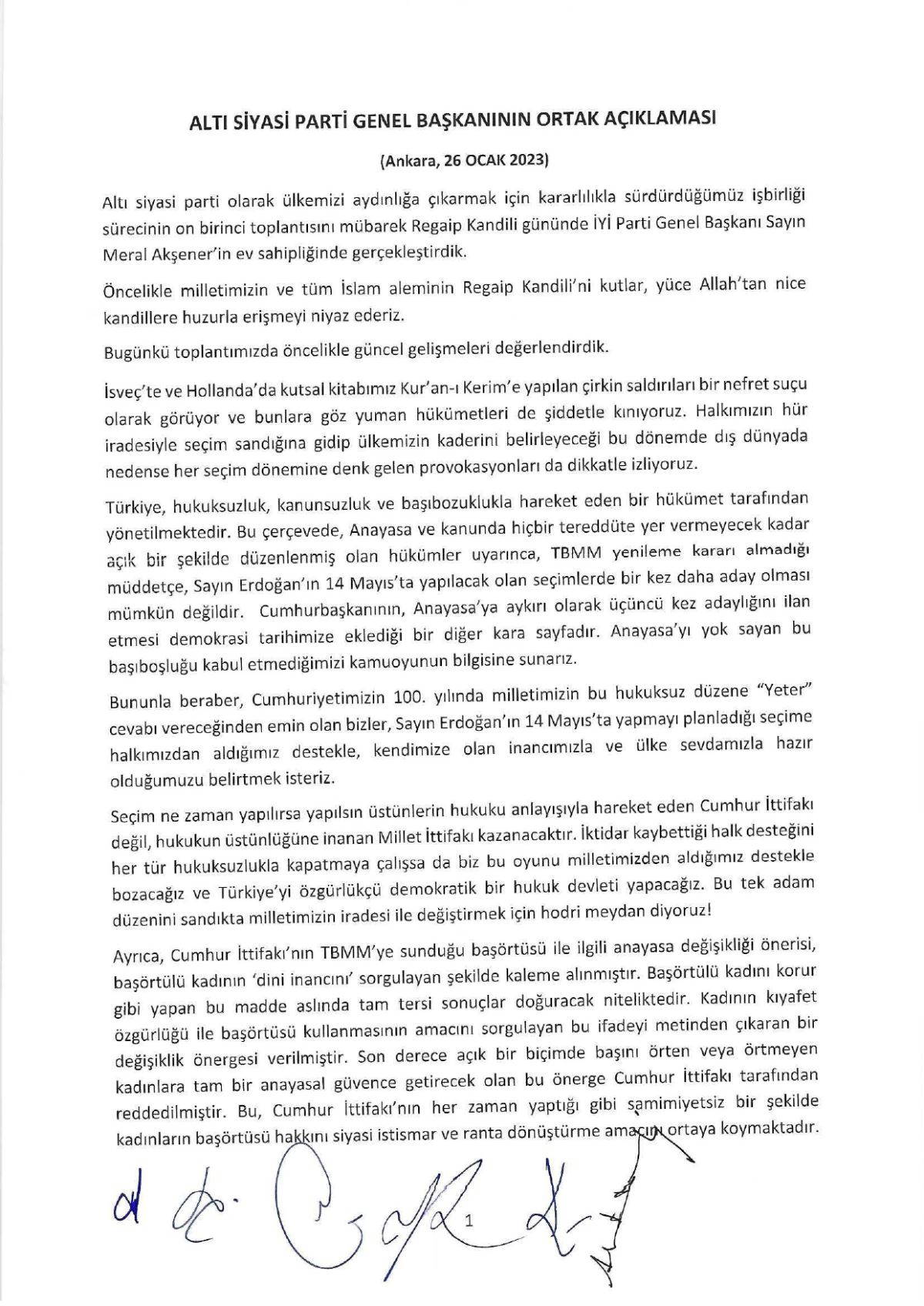 Cumhurbaşkanı adayını belirleme konusunda altı siyasi partinin istişare, uzlaşı ve halkın tercihlerini yansıtacak şekilde çalıştığını buradan duyurmak isteriz. Halkımız, ülkemizin hak ettiği refaha ulaşma ve yeniden demokratikleşme ümidini altı partinin birliğinde görmektedir. Bu da bize tarihi bir görev yüklemektedir. Biliyoruz ki bu Türkiye’nin kader seçimidir. Halkımız canını, malını, geleceğini, medeni, hür ve refah içinde bir Türkiye’de nefes alma ümidini bize emanet etmiştir. Halkımız müsterih olsun, altı parti bu görevi layıkıyla tamamlayacaktır.