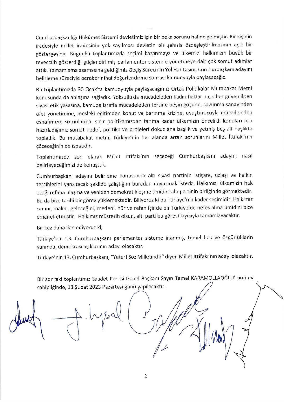 Bir sonraki toplantımız Saadet Partisi Genel Başkanı Sayın Temel KARAMOLLAOĞLU’ nun ev sahipliğinde, 13 Şubat 2023 Pazartesi günü yapılacaktır."