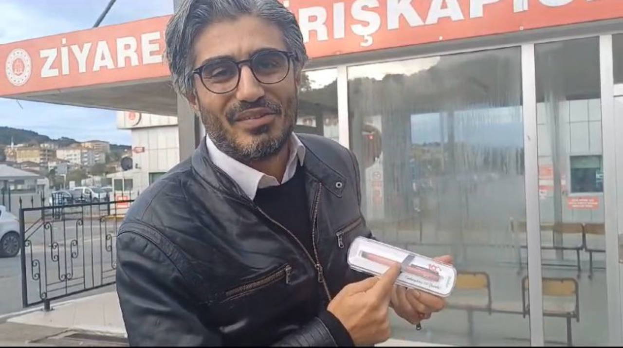 Gazeteci Barış Pehlivan'ı cezaevinde karşılamaya gelen sanatçı ve Cumhuriyet yazarı Müjdat Gezen, Pehlivan'a kalem hediye etti.