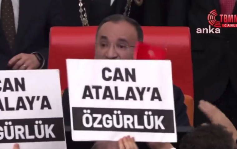 Can Atalay’ın milletvekilliğinin düşürülmesi kararını okuyan Bekir Bozdağ’ın yüzüne anayasa kitapçığı fırlatıldı.