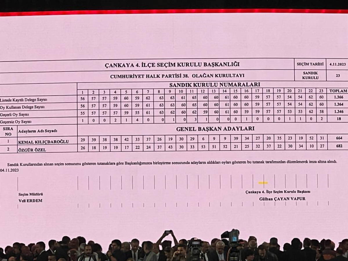 Ankara’da yapılan CHP’nin 38. Olağan Kurultayı’nda Özgür Özel 682, Kemal Kılıçdaroğlu ise 664 oy aldı.