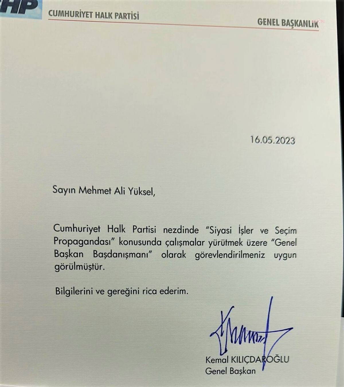 Görevlendirme yazısında, “Sayın Mehmet Ali Yüksel, CHP nezdinde ‘Siyasi İşler ve Seçim Propagandası’ konusunda çalışmalar yürütmek üzere Genel Başkan Başdanışmanı olarak görevlendirmeniz uygun görülmüştür” denildi.