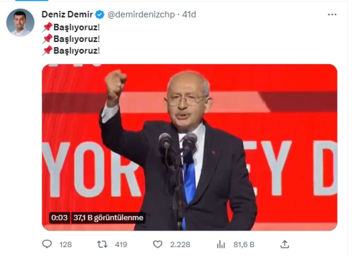 Millet İttifakı’nın toplantısının ardından CHP Genel Başkan Başdanışmanı Deniz Demir, sosyal medya hesabından yaptığı açıklamada, "Başlıyoruz!" ifadelerini kullanarak bir video yayımladı.