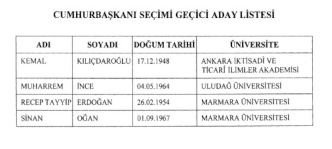 Yüksek Seçim Kurulunun (YSK) Cumhurbaşkanı seçimi geçici aday listesi yayımlandı.