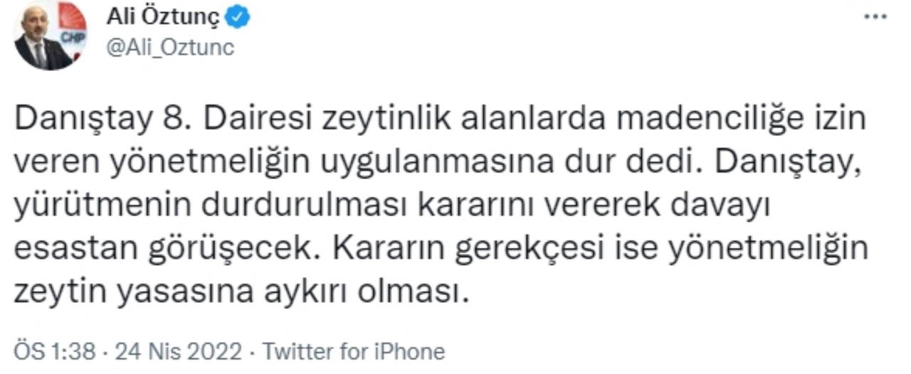 "Danıştay 8. Dairesi zeytinlik alanlarda madenciliğe izin veren yönetmeliğin uygulanmasına dur dedi. Danıştay, yürütmenin durdurulması kararını vererek davayı esastan görüşecek. Kararın gerekçesi ise yönetmeliğin zeytin yasasına aykırı olması."
