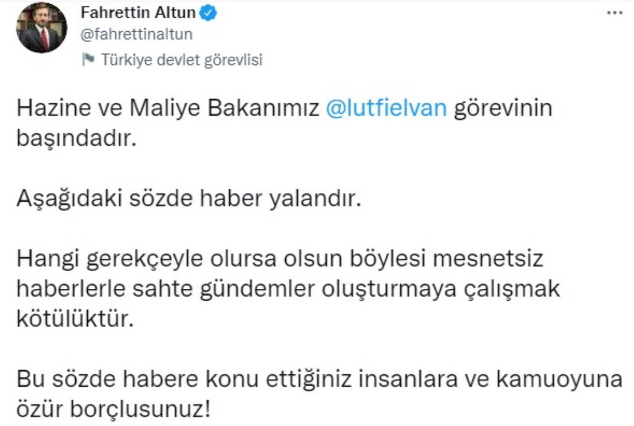 "Hazine ve Maliye Bakanımız Lütfi Elvan görevinin başındadır. Aşağıdaki sözde haber yalandır. Hangi gerekçeyle olursa olsun böylesi mesnetsiz haberlerle sahte gündemler oluşturmaya çalışmak kötülüktür. Bu sözde habere konu ettiğiniz insanlara ve kamuoyuna özür borçlusunuz!"