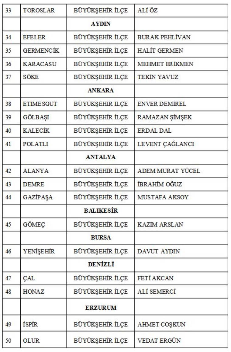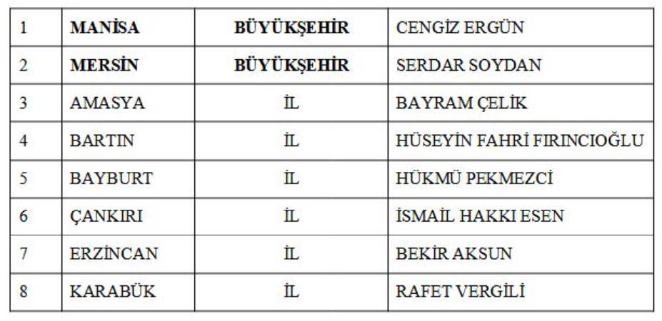 Buna göre partinin Mersin Büyükşehir Belediye Başkanı adayı Serdar Soydan olurken, Manisa Büyükşehir Belediye Başkan adayı ise Cengiz Ergün olarak belirlendi.