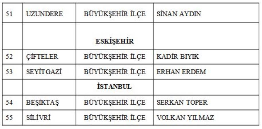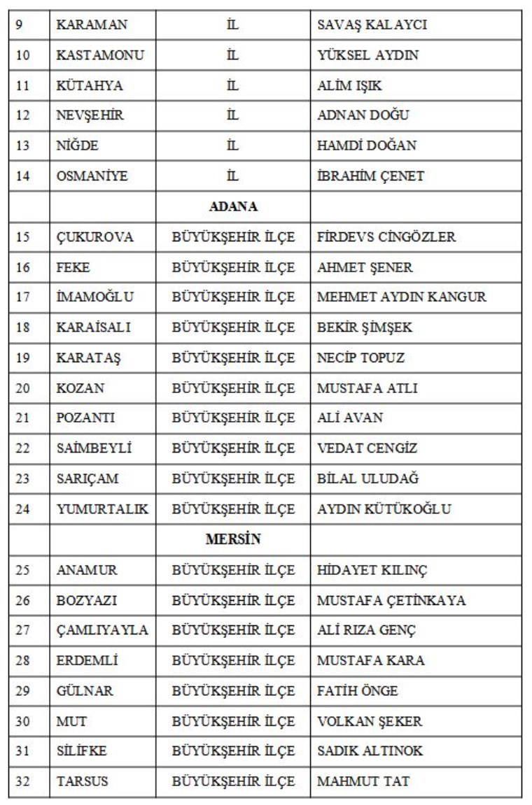 MHP'nin 2 büyükşehir, 12 il ve 41 büyükşehir ilçe belediye başkan adayı şöyle: