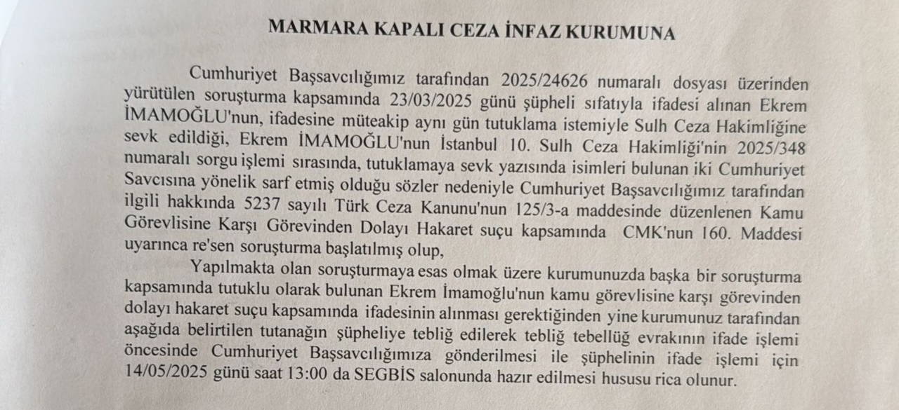 Tutuklu bulunan İBB Başkanı ve Cumhuriyet Halk Partisi'nin cumhurbaşkanı adayı Ekrem İmamoğlu'na, savcılara yönelik sözleri nedeniyle "kamu görevlisine görevinden dolayı hakaret" suçuyla bir soruşturma daha açıldı.
