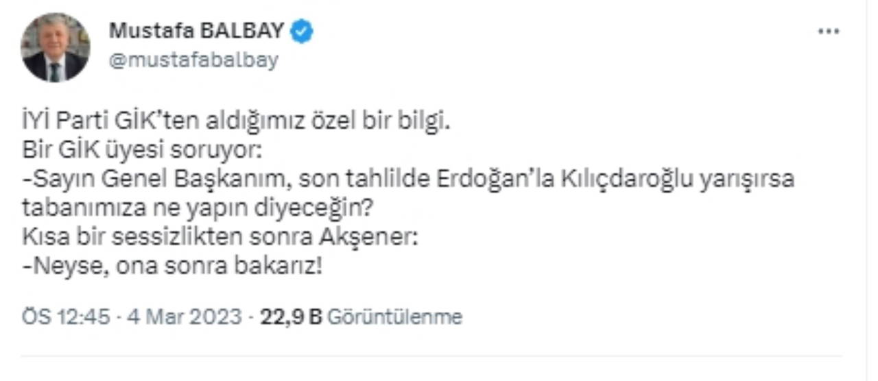 Gazetemiz yazarı Mustafa Balbay'ın "İYİ Parti GİK’ten aldığımız özel bir bilgi" diyerek sosyal medya hesabından yaptığı paylaşıma göre Akşener, bir İYİ Genel İdare Kurulu üyesinin "Erdoğan’la Kılıçdaroğlu yarışırsa tabanımıza ne yapın diyeceğiz" sorusu üzerine "Ona sonra bakarız" yanıtı verdi.