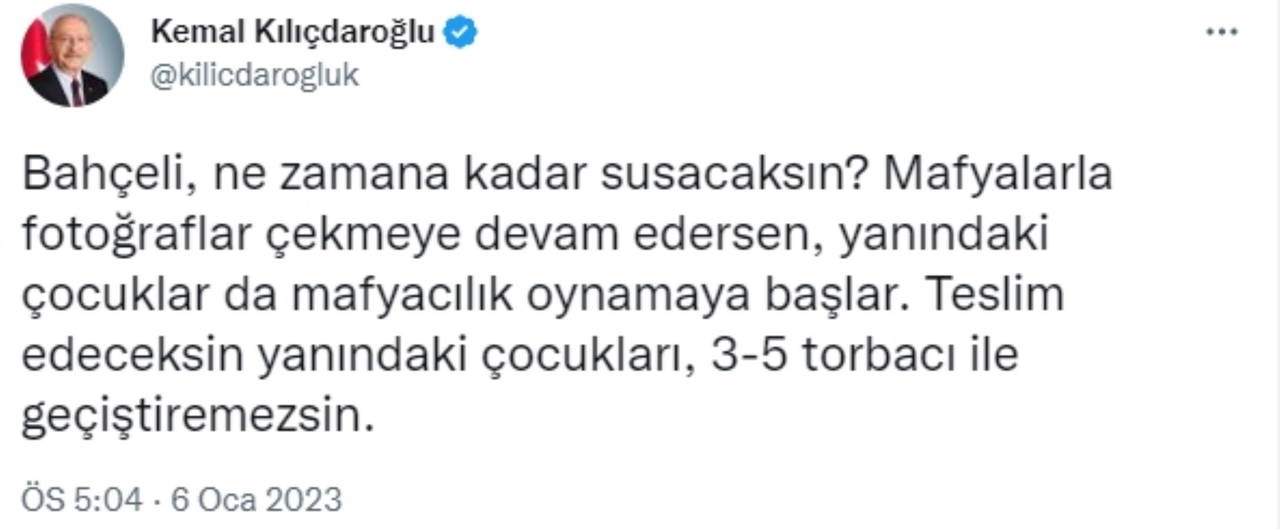 "Bahçeli, ne zamana kadar susacaksın?" diyen Kılıçdaroğlu, "Mafyalarla fotoğraflar çekmeye devam edersen, yanındaki çocuklar da mafyacılık oynamaya başlar. Teslim edeceksin yanındaki çocukları, 3-5 torbacı ile geçiştiremezsin" ifadelerini kullandı.