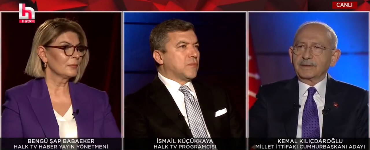 Millet İttifakı'nın ortak Cumhurbaşkanı adayı ve Cumhuriyet Halk Partisi (CHP) Genel Başkanı Kemal Kılıçdaroğlu, Halk TV'de 'Liderler Masası' programında gazeteciler Bengü Şap Babaeker ve İsmail Küçükkaya’nın sorularını yanıtladı.