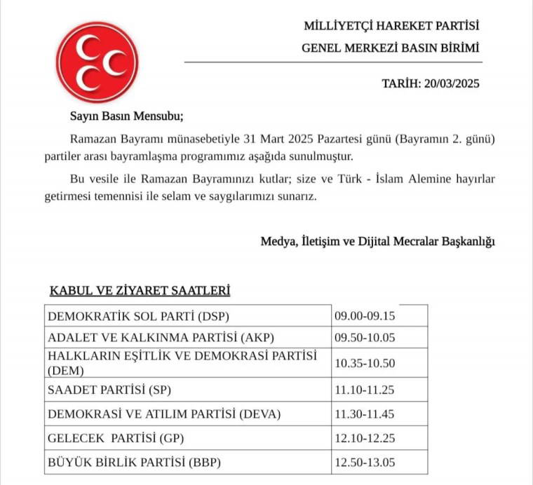 MHP’nin ziyaret yapacağı siyasi partiler arasında DSP, AKP, DEM Parti, Saadet Partisi, DEVA Partisi, Gelecek Parti ve BBP bulunuyor. MHP’nin ziyaret programında, CHP, İYİ Parti ve Yeniden Refah Partisi yer almıyor. Ziyaretleri MHP Genel Sekreteri İsmet Büyük Ataman, MHP Genel Başkan Danışmanı Esma Özdaşlı ve MYK Üyesi Şahin Kartal yapacak.