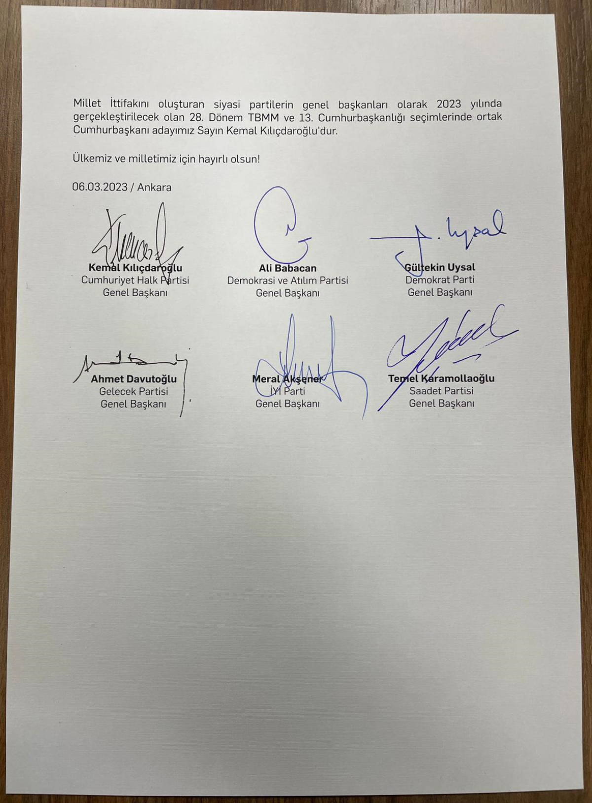 Güçlendirilmiş Parlamenter sisteme geçiş vaat eden ve Millet İttifakı çatısı altında bir araya gelen CHP, İYİ Parti, Saadet Partisi, DEVA, Demokrat Parti ve Gelecek Partisi, Millet İttifakı'nın Cumhurbaşkanı adayını ilan etmek üzere Saadet Partisi'nin ev sahipliğinde toplandı.