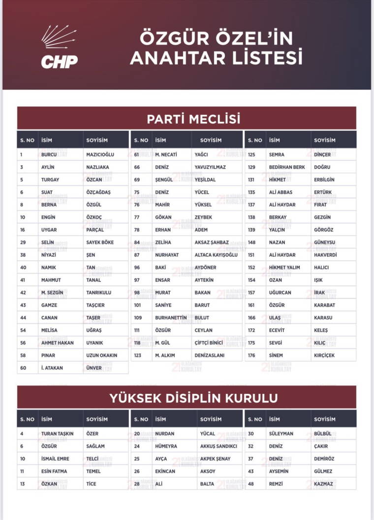 Özel aynı şekilde Gençlik Kolları Başkanı Cem Aydın’ın yerine de “Her şey çok güzel olacak” sloganını Türkiye’ye tanıtan Berkay Gezgin’in PM’de yer alacağını da duyurdu. Onların yanı sıra Yurt Dışı Örgütlerden Sorumlu Parti Meclisi Üyesi Mehmet Tüm, Hüseyin Yaşar, Orhan Sarıbal, Emin Umut Dikili ve Erbil Aydınlık; Özel’in anahtar listesinde yer almadı.