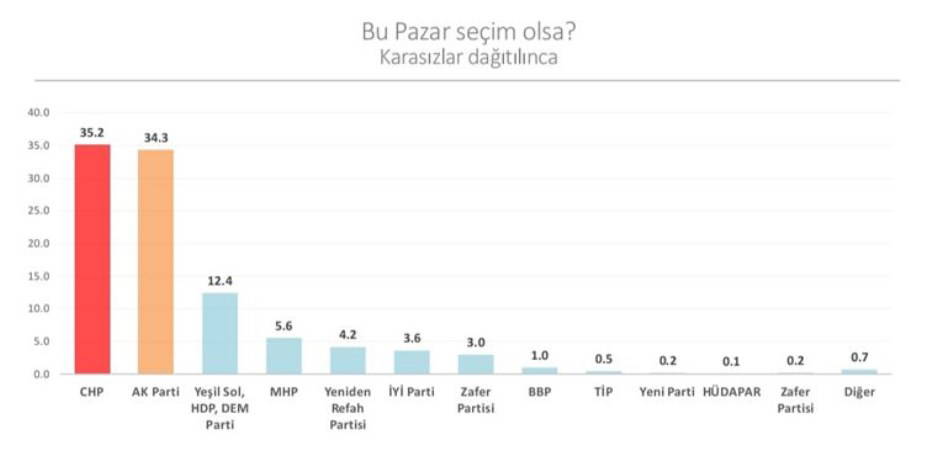 Kararsızlar, fikir belirtmeyenler ve oy kullanmayacaklarını söyleyenlerin oyu aritmetik dağıtıldığında ise CHP yüzde 35,2'lik oy oranına, AKP ise yüzde 34,3'e ulaşıyor. Üçüncü sırada yüzde 12,4 ile DEM Parti, dördüncü sırada yüzde 5,6 ile MHP, beşinci sırada yüzde 4,2 ile Yeniden Refah Partisi yer alıyor. İYİ Parti ve Zafer Partisi ise sırasıyla yüzde 3,6 ve yüzde 3'lük oy oranına ulaşıyor.