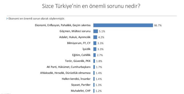 Genel yaşam memnuniyeti anketinde ise katılımcıların Türkiye'de en çok ekonomik zorluklardan şikayetçi olduğu görüldü. Katılımcıların yüzde 66,7'si Türkiye'nin en büyük problemi olarak ekonomiyi gösterdi.