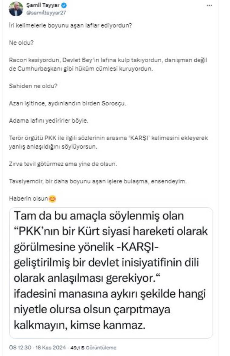 Şamil Tayyar da bunun üzerine, Uçum'un açıklamasındaki ilgili kısmın görseli eşliğinde yeni bir paylaşım yaparak "Azarı işitince, aydınlandın birden Sorosçu. Adama lafını yedirirler böyle. Terör örgütü PKK ile ilgili sözlerinin arasına 'KARŞI' kelimesini ekleyerek yanlış anlaşıldığını söylüyorsun. Zırva tevil götürmez ama yine de olsun. Tavsiyemdir, bir daha boyunu aşan işlere bulaşma, ensendeyim" dedi.