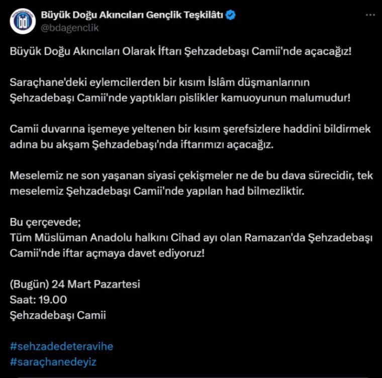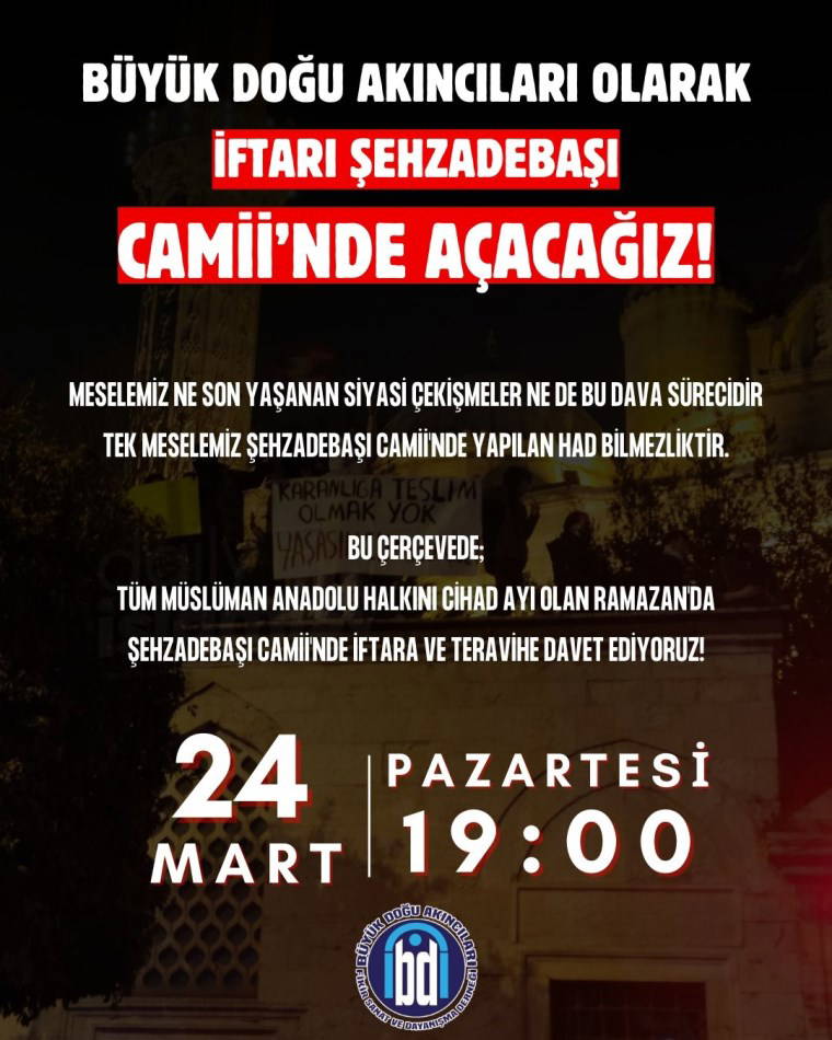 "Büyük Doğu Akıncıları Olarak İftarı Şehzadebaşı Camii'nde açacağız! Saraçhane'deki eylemcilerden bir kısım İslâm düşmanlarının Şehzadebaşı Camii'nde yaptıkları pislikler kamuoyunun malumudur! Camii duvarına işemeye yeltenen bir kısım şerefsizlere haddini bildirmek adına bu akşam Şehzadebaşı'nda iftarımızı açacağız.