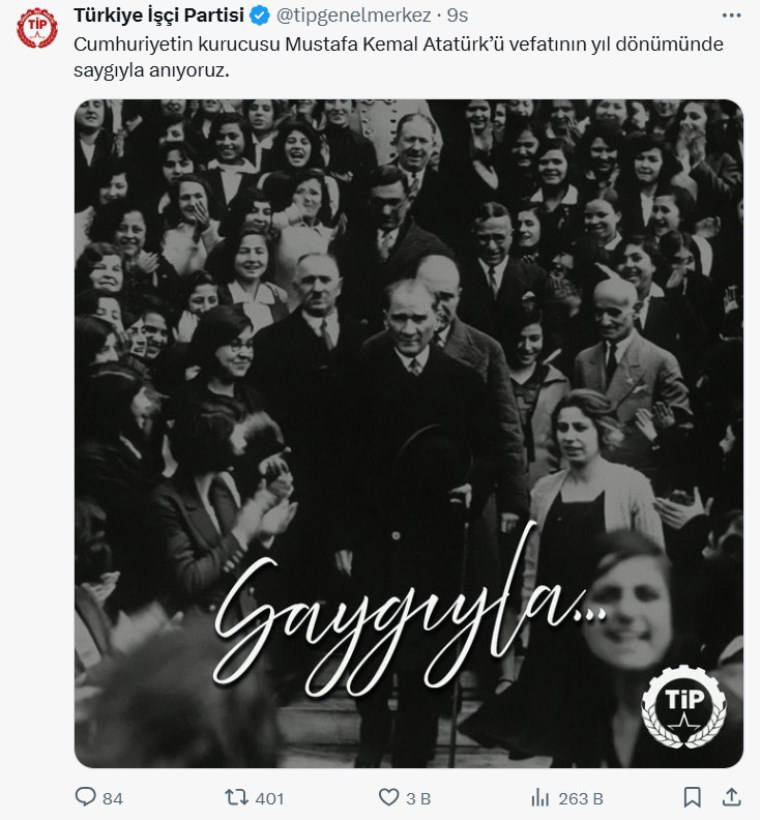 TİP, HKP, TKP ve Devrim Hareketi, Atatürk'ün ölümünün 86'ncı yıl dönümü dolayısıyla anma mesajı yayınladı. TİP'ten yapılan açıklamada "Cumhuriye’tin kurucusu Mustafa Kemal Atatürk’ü vefatının yıl dönümünde saygıyla anıyoruz" denildi.