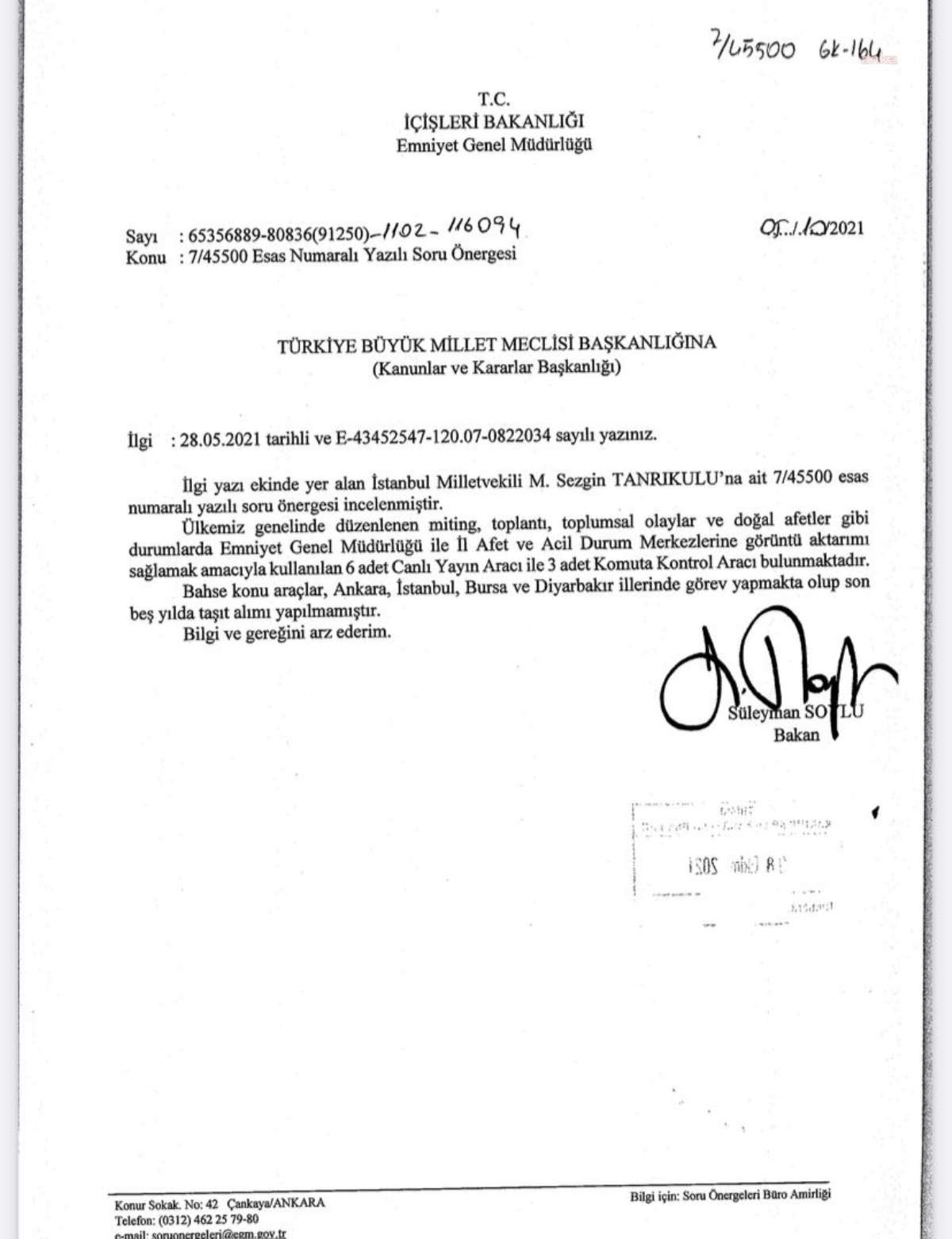 Süleyman Soylu, önergeye süresi geçtikten sonra verdiği yanıtta, “Ülkemiz genelinde düzenlenen miting, toplantı, toplumsal olaylar ve doğal afetler gibi durumlarda Emniyet Genel Müdürlüğü ile İl Afet ve Acil Durum Merkezlerine görüntü aktarımı sağlamak amacıyla kullanılan 6 adet canlı yayın aracı ile 3 adet komuta kontrol aracı bulunmaktadır. Bahse konu araçlar; Ankara, İstanbul, Bursa ve Diyarbakır illerinde görev yapmakta olup, son 5 yılda taşıt alımı yapılmamıştır” dedi.