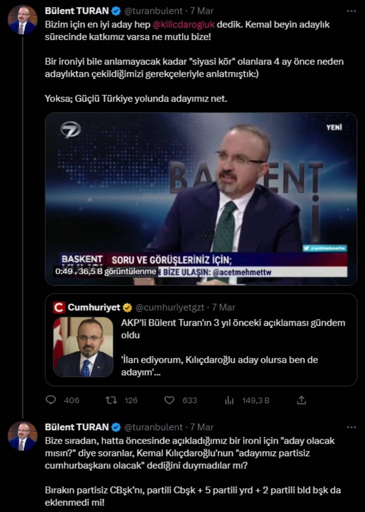 Siyasi dostlarına rağmen aday olamaz. Kılıçdaroğlu siyasette aday olmak, lider olmak için genel başkan olmuş biri değil. İlan ediyorum, Kemal Kılıçdaroğlu 2023’te cumhurbaşkanı adayı olsun ben de Çanakkale milletvekili Bülent Turan olarak Cumhurbaşkanlığı'na adayım.”