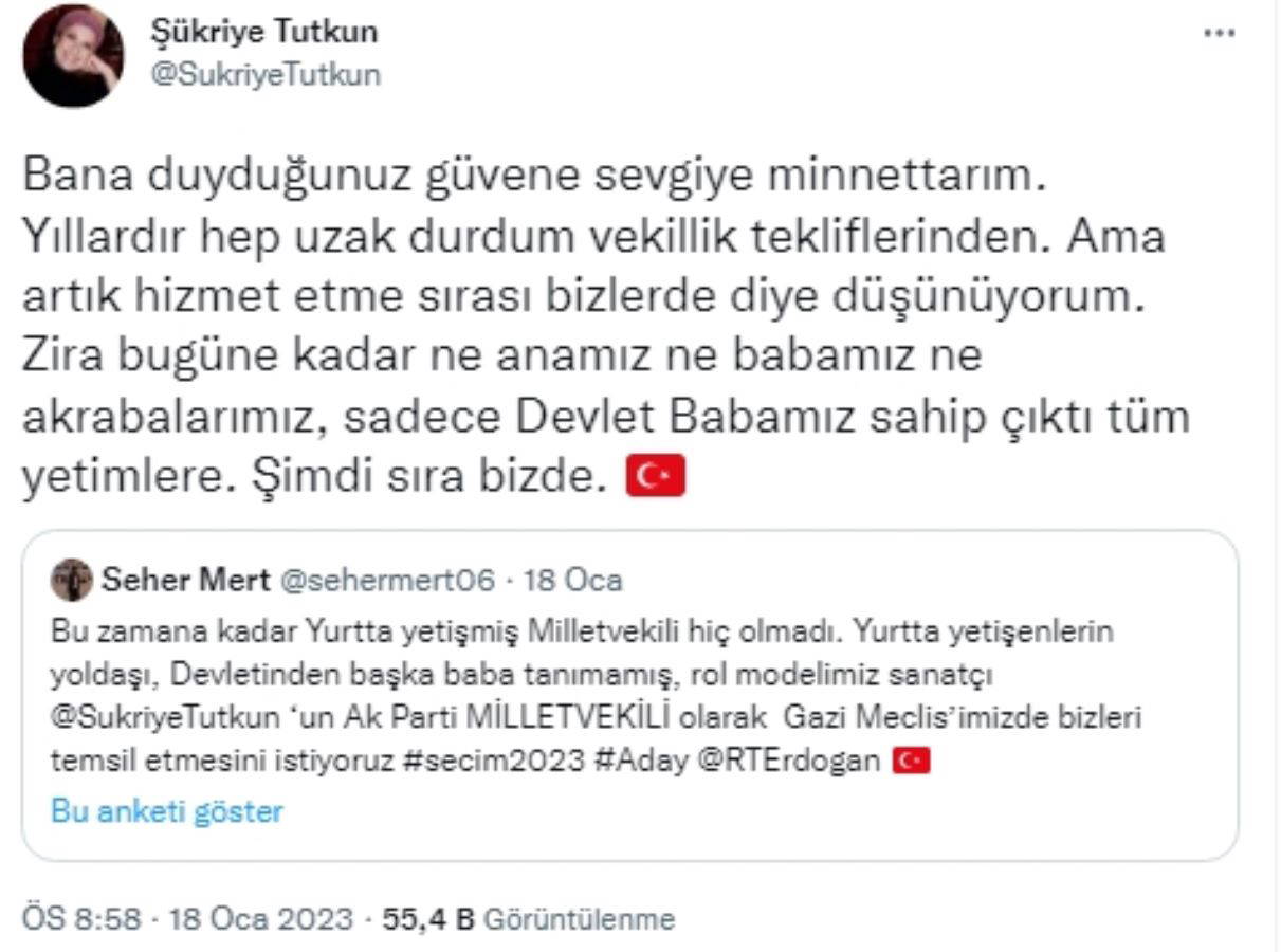Şarkıcı Şükriye Tutkun, AKP’den milletvekilliği aday adaylığına talip olduğunu duyurdu.