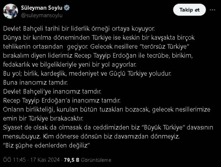 Soylu, sosyal medya hesabından yaptığı paylaşımda "Devlet Bahçeli tarihi bir liderlik örneği ortaya koyuyor" dedi.