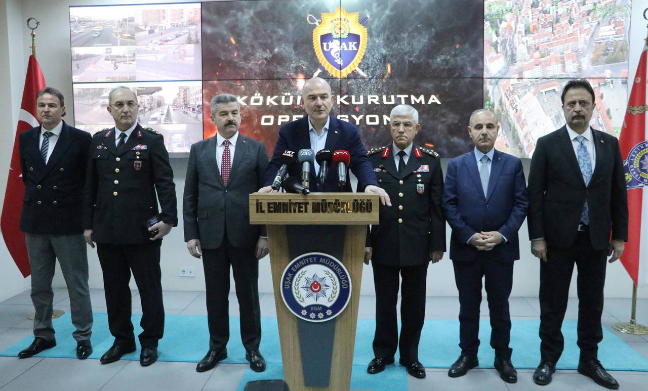 Saat 06.00 sıralarında Uşak İl Emniyet Müdürlüğü'ne gelen Bakan Soylu, operasyona katılan polislere başarılar diledi. Bakan Soylu, operasyonun ardından açıklamalarda bulundu. Bakan Soylu, 33'üncüsü düzenlenen 'Kökünü Kurutma Operasyonu'na 609 polis ve jandarmanın katıldığını, 127 hedefe yönelik düzenlenen operasyonda 120 şüphelinin gözaltına alındığını söyledi.