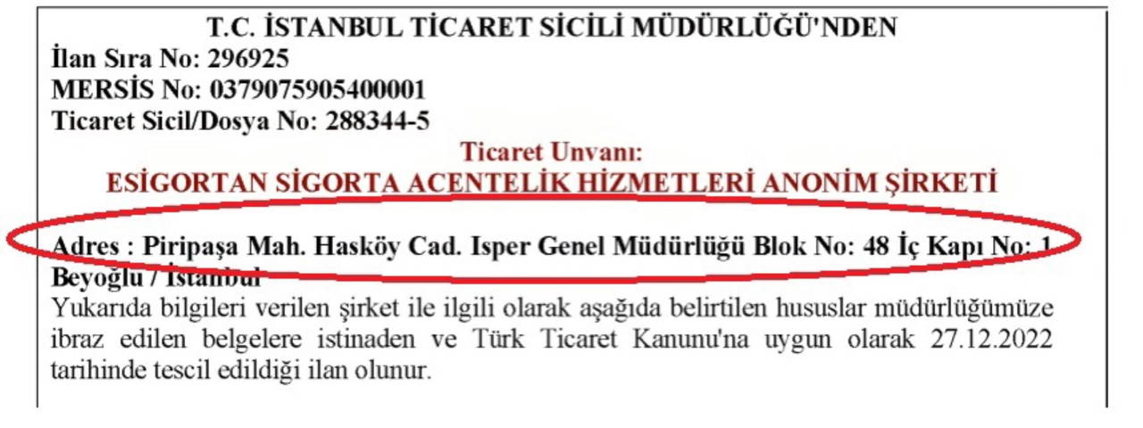 Süleyman Soylu’nun geçen ağustos ayında ortaklıktan ayrıldığı şirket, bu büyümenin ardından yeni adresine taşındı. Esigortan Sigorta Acentelik Hizmetleri Anonim Şirketi’nin yeni adresi İstanbul’un Beyoğlu ilçesinde yer alan İsper binası oldu. Şirketin açık adresi resmi belgelerde 7 Ekim 2022 itibarıyla “İsper Genel Müdürlüğü blok no: 48” olarak değiştirildi.