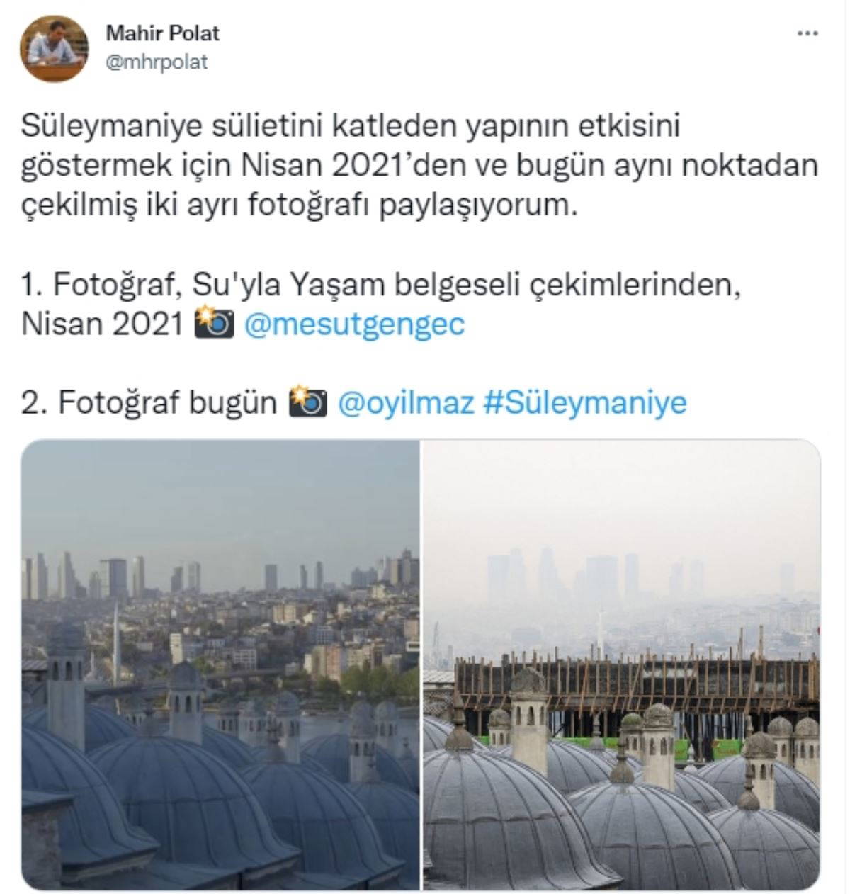 Polat, bunun üzerine yaptığı bir başka paylaşımda da Süleymaniye'nin silüetini ortadan kaldıran yapının etkisini göstermek için Nisan 2021’den ve dün (3 Şubat 2022) aynı noktadan çekilmiş iki ayrı fotoğrafı paylaştı.
