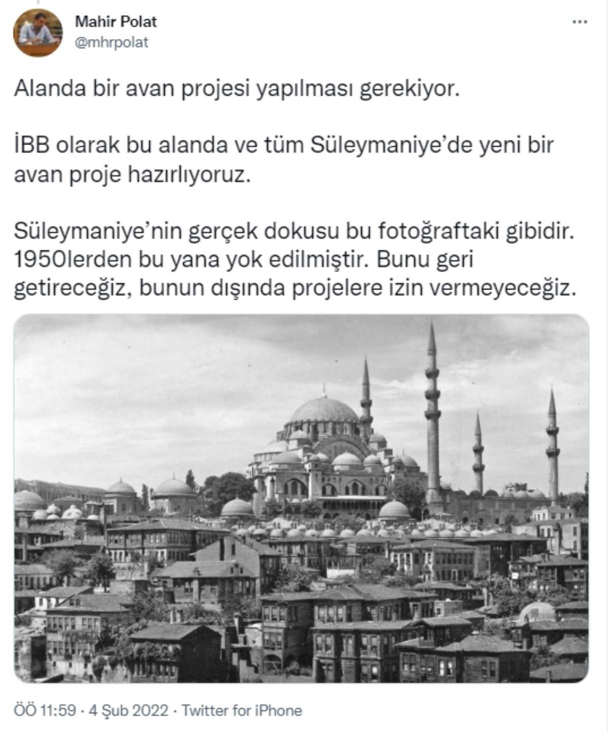 Alanda bir avan projesi yapılması gerektiğini belirten Polat, "İBB olarak bu alanda ve tüm Süleymaniye’de yeni bir avan proje hazırlıyoruz. Süleymaniye’nin gerçek dokusu bu fotoğraftaki gibidir. 1950lerden bu yana yok edilmiştir. Bunu geri getireceğiz, bunun dışında projelere izin vermeyeceğiz" vurgusu yaptı.