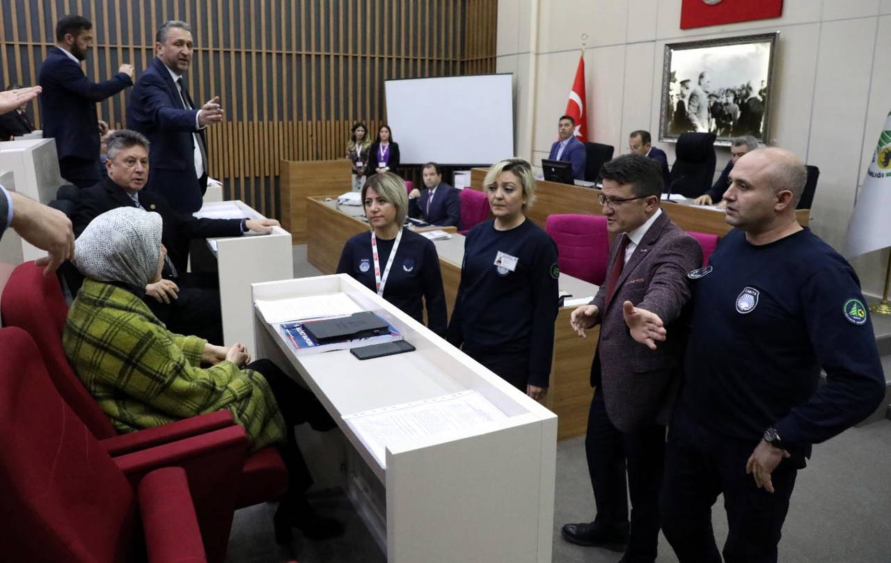 Bunun üzerine Tanju Özcan, zabıtaya Hacer Çınar’ın salondan çıkarılması talimatını verdi. Zabıta ekiplerinin gelmesi üzerine AKP’li diğer meclis üyeleri, Hatice Çınar’ın çevresinde toplandı. AKP meclis üyeleri ile Başkan Özcan arasında sert tartışmalar yaşandı.
