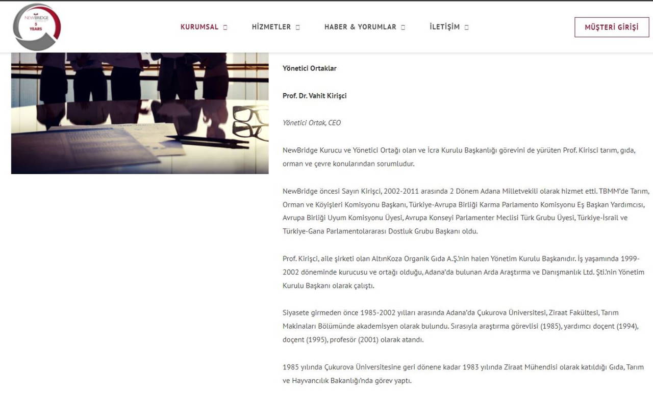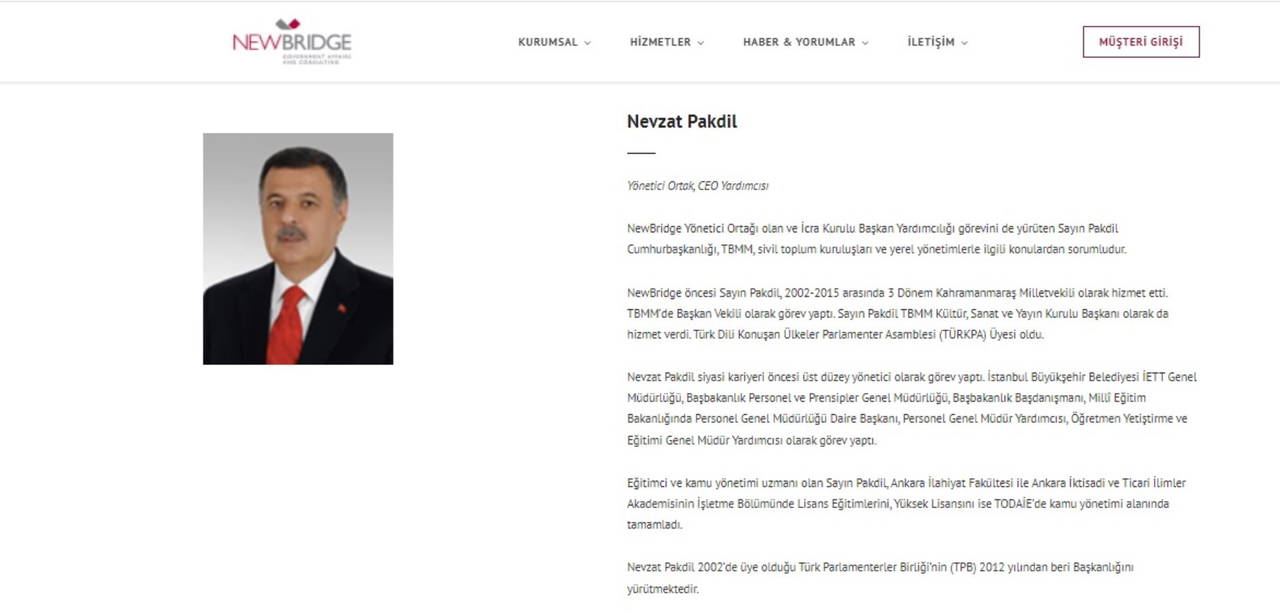 Haberde Nevzat Pakdil'in NewBridge şirketinin resmi internet sitesinde yer alan bilgilerini gösteren görsele yer verildi: