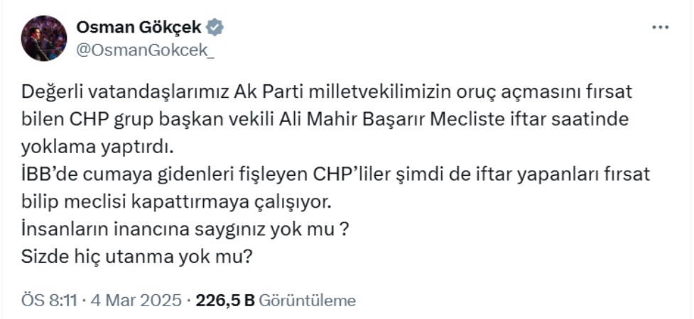 AKP'li Osman Gökçek, sosyal medya hesabından yaptığı paylaşımda CHP'li Ali Mahir Başarır'ın orucunu açan AKP'lilerin yokluğunu fırsat bilerek oylama yaptırdığını iddia etti.