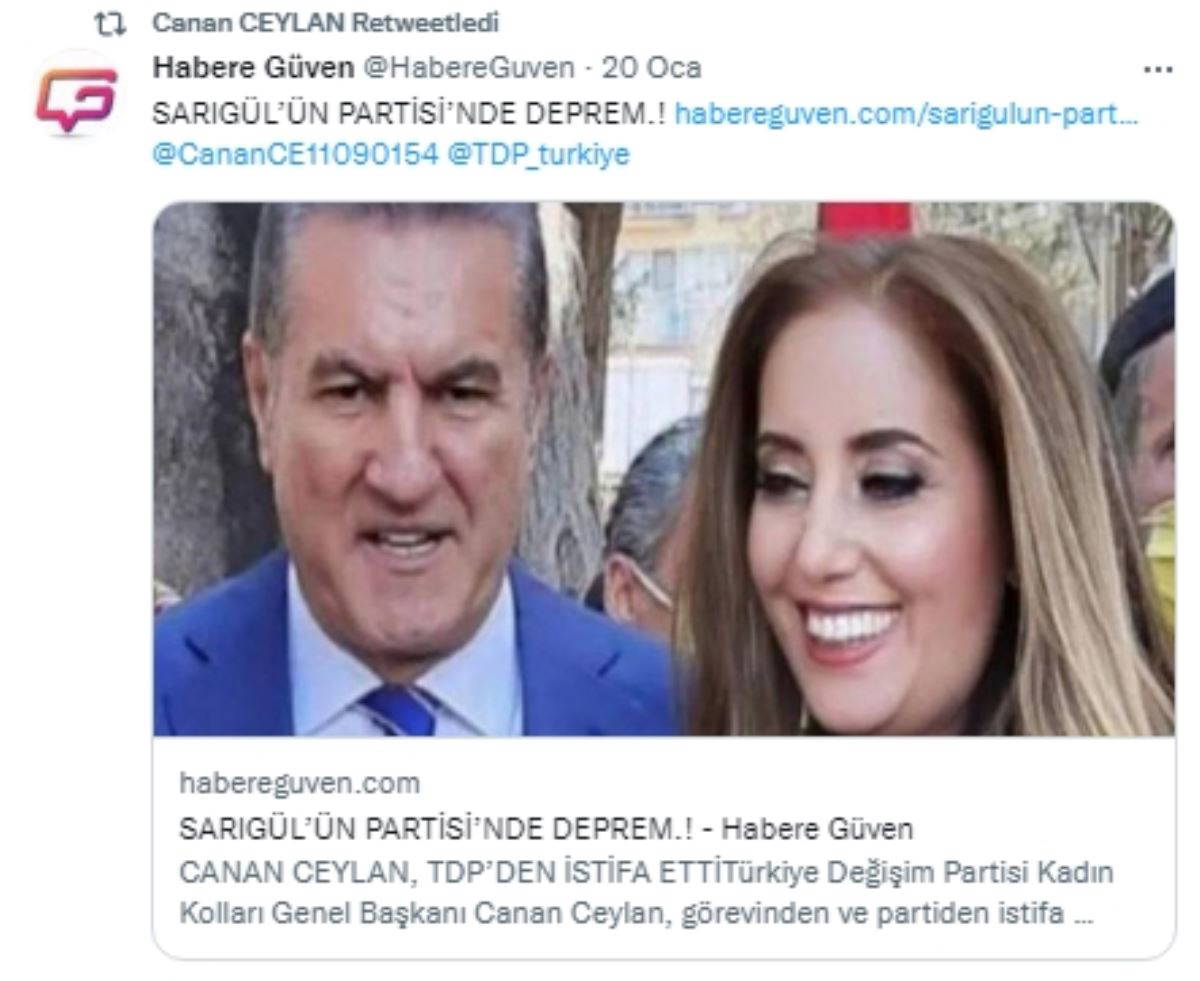 Mustafa Sarıgül’ün liderliğindeki Türkiye Değişim Partisi'nin yönetiminde istifa depremi yaşandı. Partinin Kadın Kolları Genel Başkanı Canan Ceylan, partisinden istifa ettiğini açıkladı.