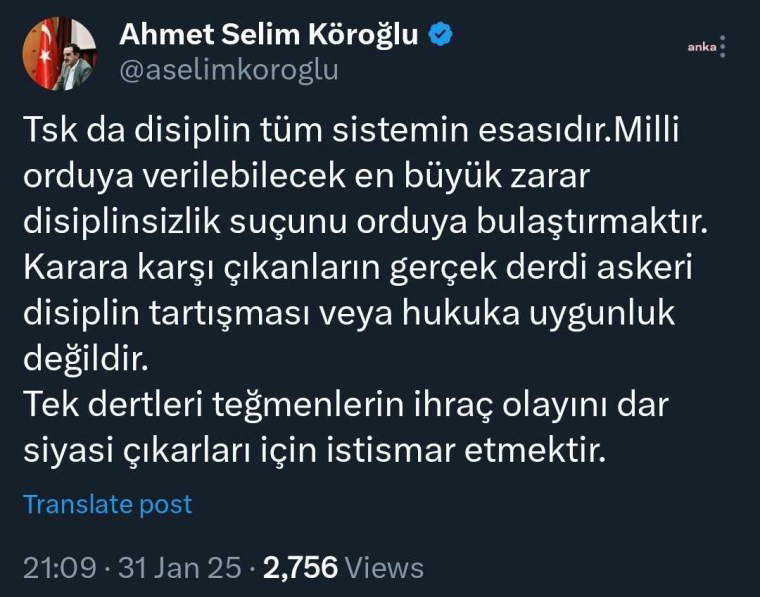 "TSK'da disiplin tüm sistemin esasıdır. Milli orduya verilebilecek en büyük zarar disiplinsizlik suçunu orduya bulaştırmaktır. Karara karşı çıkanların gerçek derdi askeri disiplin tartışması veya hukuka uygunluk değildir. Tek dertleri teğmenlerin ihraç olayını dar siyasi çıkarları için istismar etmektir."