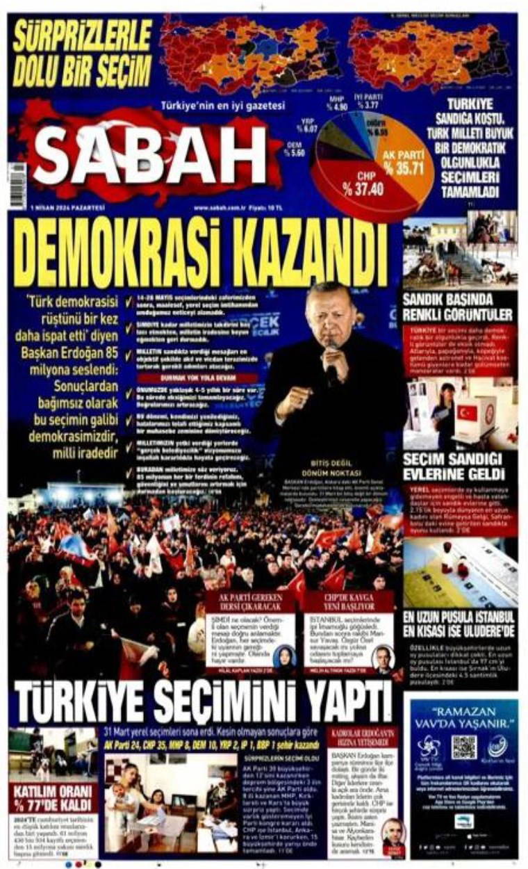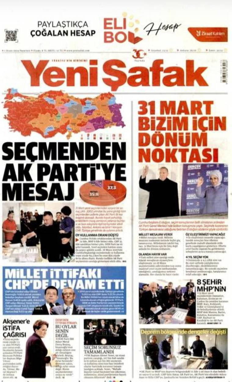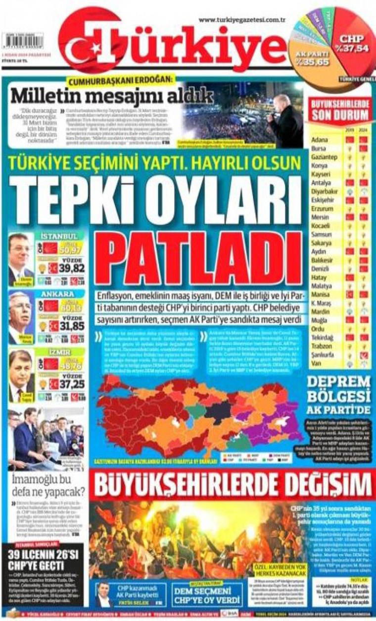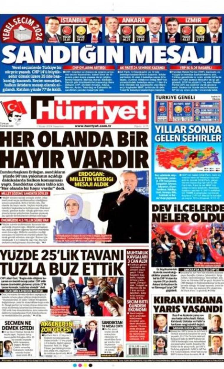 "Seçmenden AK Parti'ye mesaj" başlıklı manşette, "31 Mart yerel seçimlerinden sürpriz bir sonuç çıktı. 2002 yılından bu yana girdiği tüm seçimlerden zaferle çıkan AK Parti ilk kez başarılı olamadı. Bunda hayat pahalılığı, emeklilerin maaş zamlarını yetersiz bulması ve bazı adaylarla ilgili tartışmalar etkili oldu" denildi.