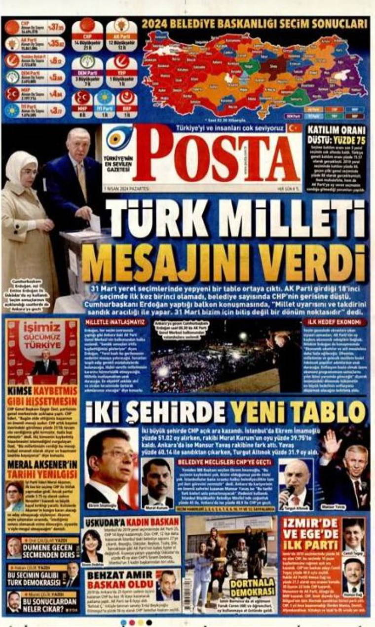 Gazetenin üst manşetinde ise "Sandığın mesajı" başlığı atıldı, "Yerel seçimlerde Türkiye bir sürpriz yaşadı. CHP 14'ü büyükşehir olmak üzere 35 ilde başkanlığı kazandı. Seçim sonuçları halkın iktidara mesajı olarak algılandı" denildi.